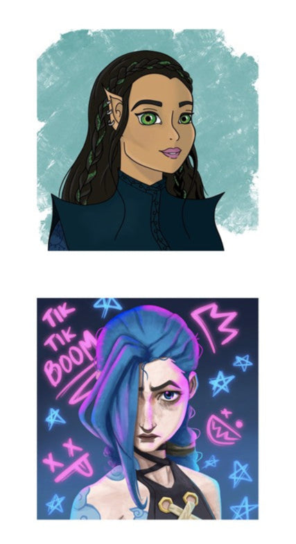 Like the rest of the world, I found myself “stuck” at home during lockdown. (Stuck is in quotations because I’m a hardcore introvert who loves to stay at home in her dragon cave. While my extroverted husband was going a little stir-crazy, our cats and I were in our element.) This was also when my friends and I started playing D&D virtually, which led me to draw my own character portrait, then their character portraits, and other friends’ character portraits, and everything kind of snowballed from there. Here’s my very first portrait from 2020 (top), and a recent 2025 Arcane fanart portrait (bottom).